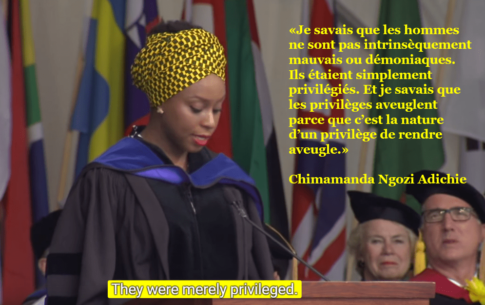Donc cette histoire ne porte pas sur ma découverte de l’injustice basée sur le genre parce que bien sûr je l’avais découverte des années auparavant. Depuis l’enfance, en regardant le monde. Je savais déjà que le monde n’étend pas aux femmes les nombreuses petites courtoisies qu’il étend aux hommes. Je savais aussi que la victimisation n’est pas une vertu. Que le fait d’être victime de discrimination ne vous rend pas en quelque sorte moralement meilleur. Je savais que les hommes n’étaient pas intrinsèquement mauvais ou démoniaques. Ils étaient simplement privilégiés. Et je savais que les privilèges aveuglent parce que c’est la nature du privilège de rendre aveugle.