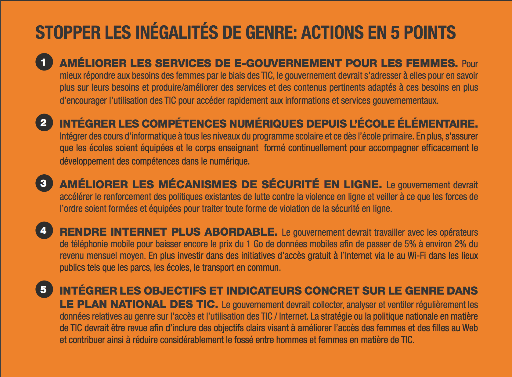 Pour réduire la fracture numérique entre les hommes et les femmes, AE Tech Consulting propose des actions en 5 points. Pour moi, plus de coopération entre le gouvernement et les communautés, organisations civiles déjà existantes, pourraient changer la donne.