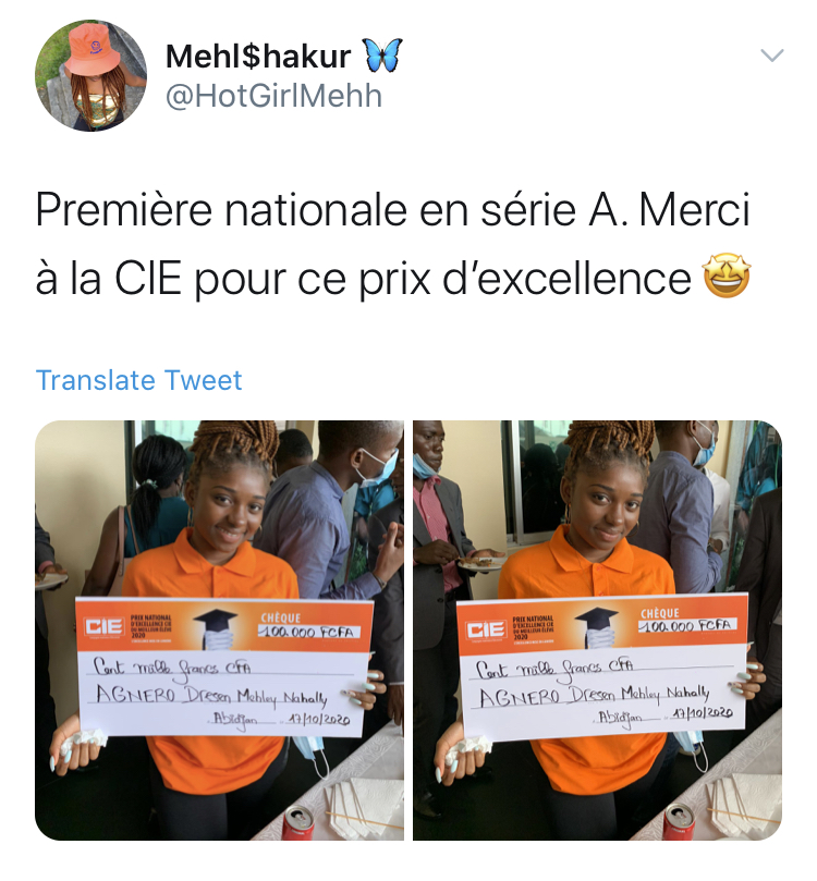 Enfin, je rappelle que le Prix National de l’Excellence CIE est surtout une reconnaissance et une mise en lumière des meilleurs élèves de Côte d’Ivoire. La lauréate elle-même ne s’est pas plainte de ses lots mais avait plutôt fait un post pour remercier la CIE pour le prix. Je comprends que l’on souhaite qu’on fasse plus pour célébrer l’excellence en milieu scolaire mais c’est la responsabilité de tout le monde et pas juste d’une entreprise privée.